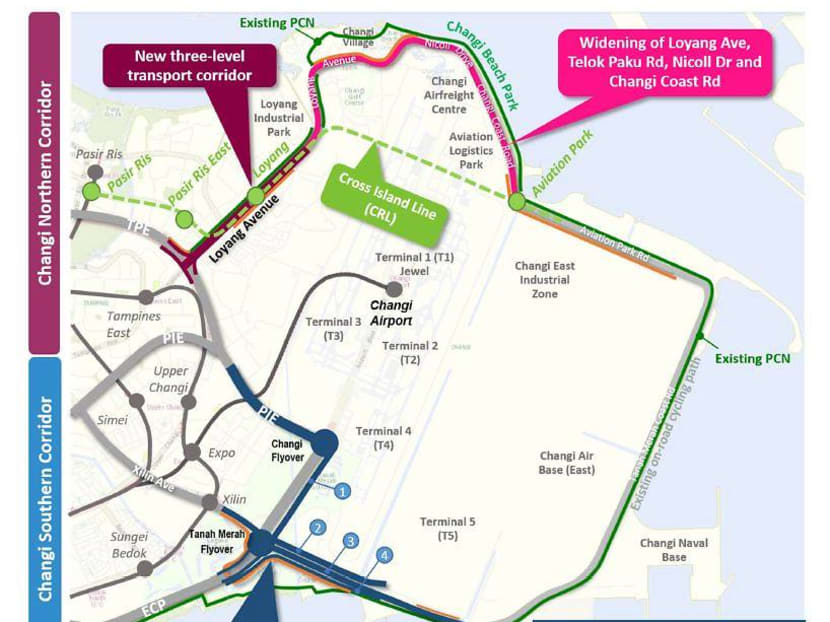 New cycling paths and roads will serve new developments in the area such as Changi Airport's Terminal 5.