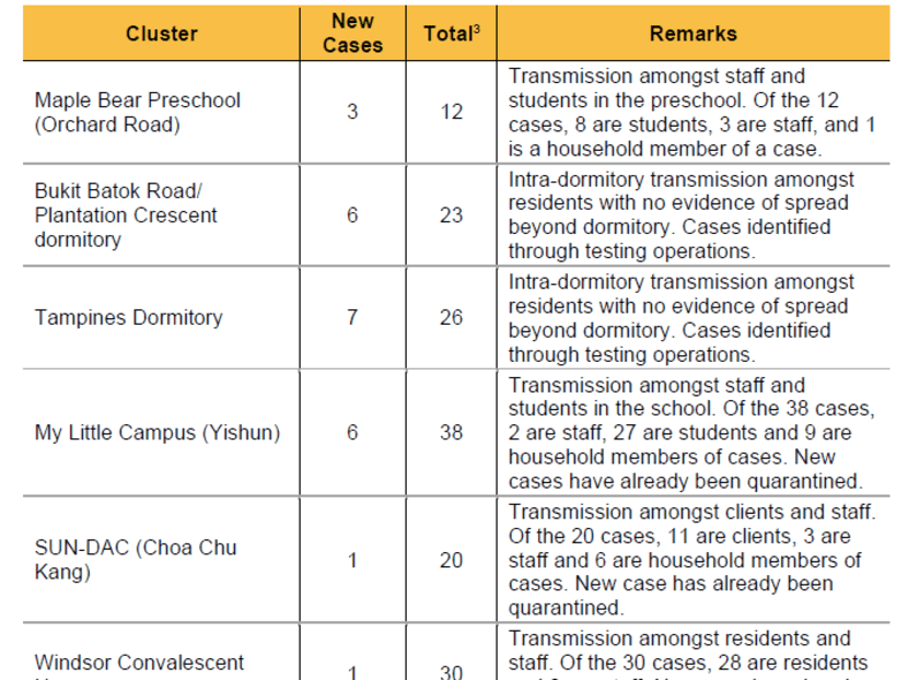 The Ministry of Health (MOH) said in its daily update on the coronavirus situation here that three new locations were added to a list of large clusters under close monitoring.