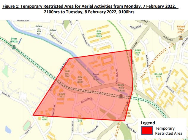 Besides The Star Vista, other areas where aerial activities will be restricted include Rochester Park, Ghim Moh Valley, Ghim Moh Edge, Dover Ville, parts of Dover Heights and Buona Vista MRT Station.