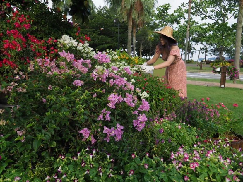 A resident tending to flowers in the contentious garden, which is on a plot that is common property in Sentosa South Cove. Photo: Raj Nadarajan/TODAY