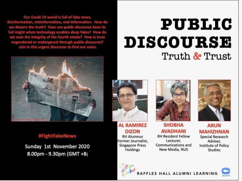 The “Public Discourse: Truth and Trust” webinar, organised by the Raffles Hall Association (RHA) and scheduled for Sunday (Nov 1), initially featured Professor Cherian George, a media studies professor at Hong Kong Baptist University, and Prof Donald Low, professor of practice at Hong Kong University of Science and Technology’s Institute of Public Policy.