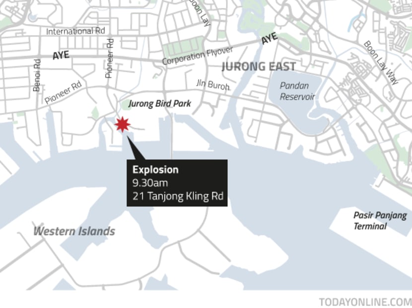 The cause of the fire is being investigated. Explosions were first heard at 9.20am at Leeden National Oxygen’s premises along Tanjong Kling Road.