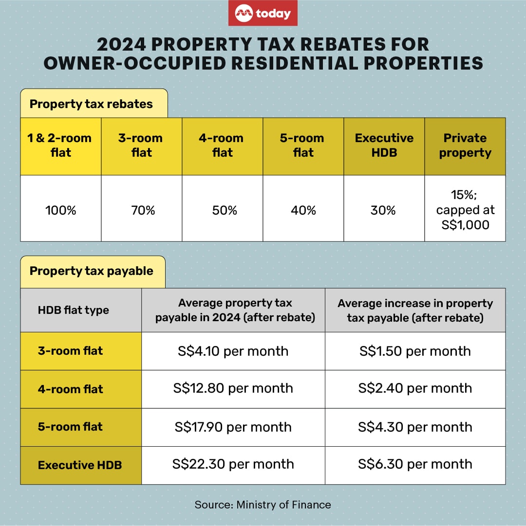 - A one-off property tax rebate for owner-occupied homes will be given in 2024 to offset the rise in property taxes from Jan 1