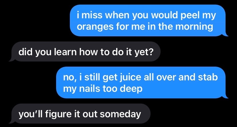 “I miss when you would peel my oranges for me in the morning,” a message from Charlotte reads.