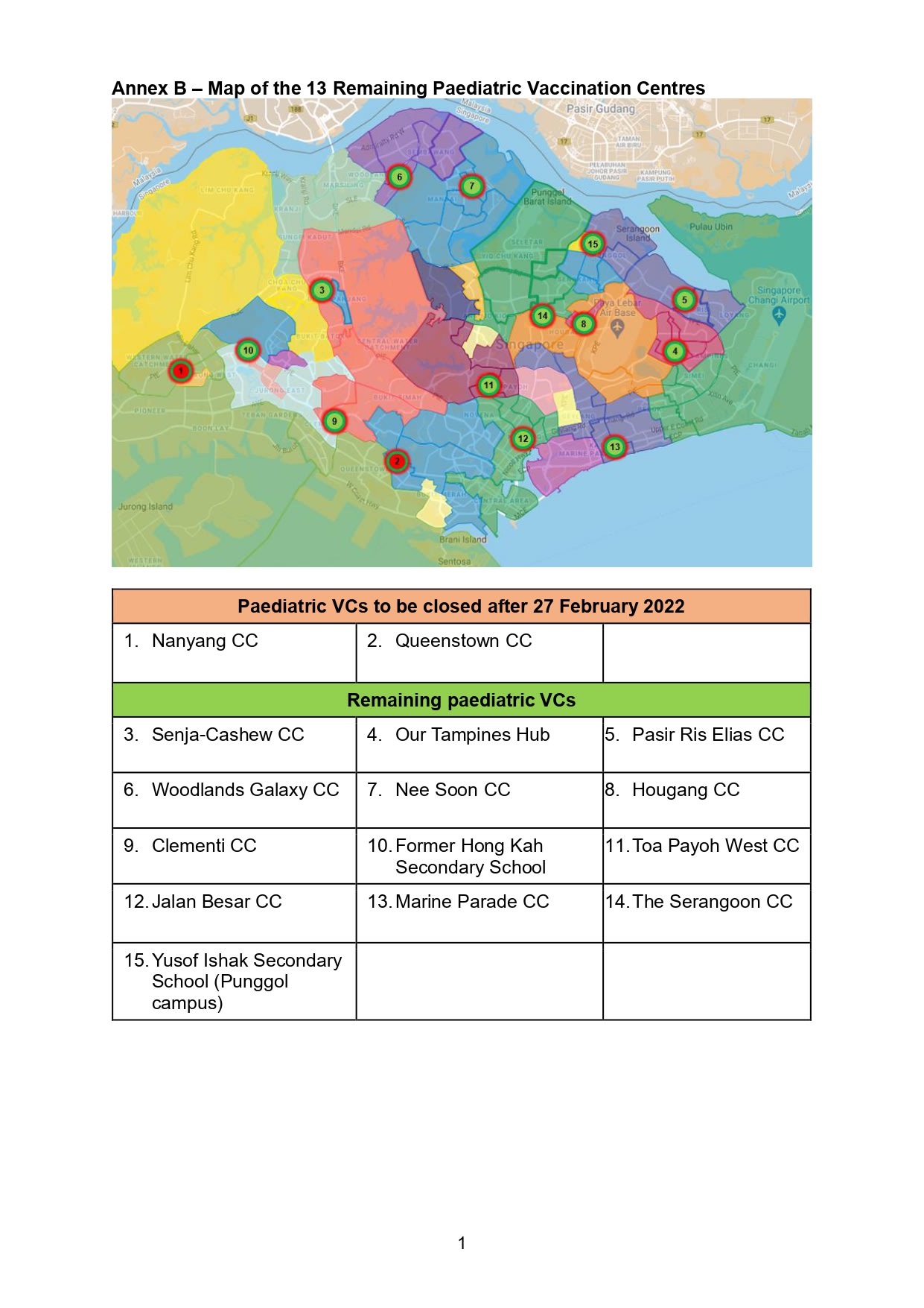 Thirteen paediatric vaccination centres will continue to operate, including the ones at Clementi Community Club as well as the site of the former Hong Kah Secondary School.