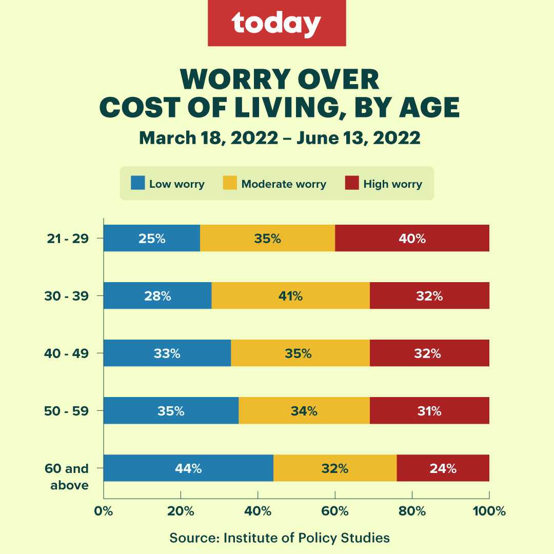 As for the breakdown based on age groups, of those aged 21 to 29, 40 per cent said that there was "high worry" over the rising cost of living, as compared to only 24 per cent for those aged 60 and above: