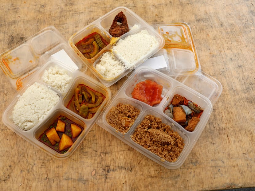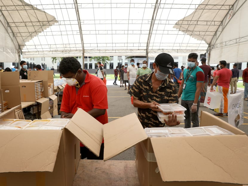 A foreign worker in Tampines Dormitory returns to his room with the catered lunch for his roommates on April 21, 2020. Workers in each room take turns to collect three meals a day from the distribution point and return to their rooms to eat.