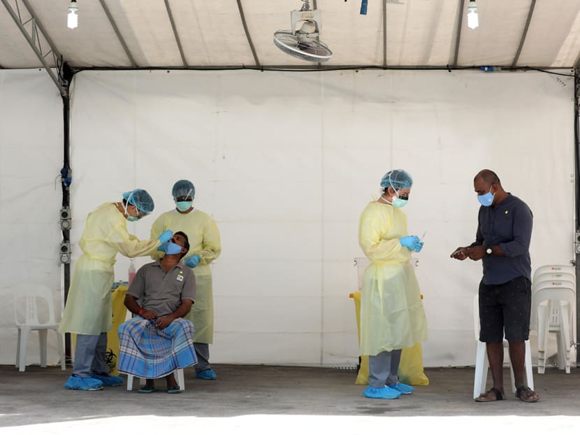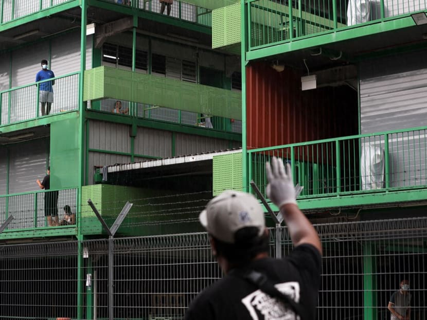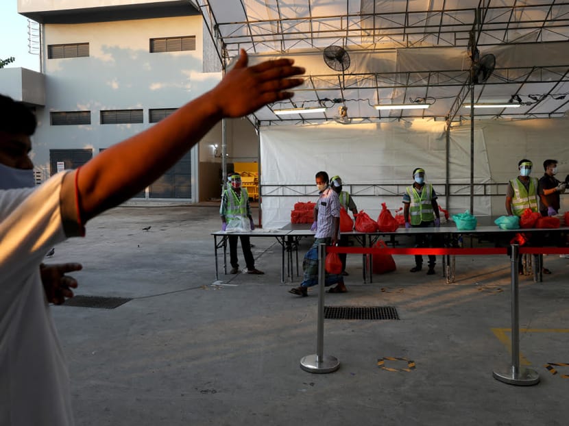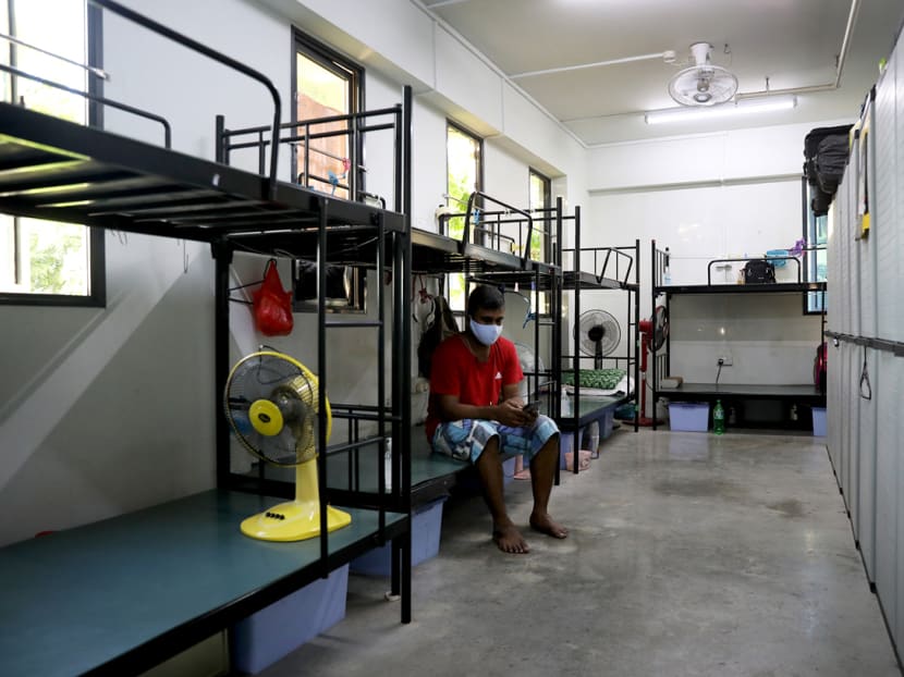 So far, there are no confirmed Covid-19 cases in this dormitory. With the tougher circuit breaker measures announced on Tuesday, foreign workers are not allowed to leave the dormitory, but they may leave their rooms to exercise and shop for necessities at the minimart within the compound at staggered timings.
