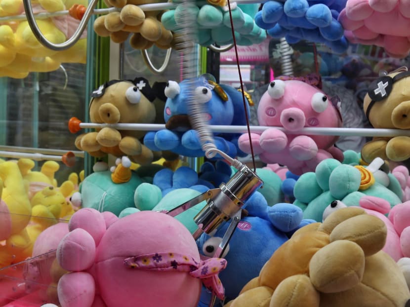 Many are in heartland malls. To play, a user moves the claw into position by manoeuvring a joystick, before pressing a button to lower the claw onto a pile of plush toys, earphones, keychains or whatever it is that the machine offers as prizes.