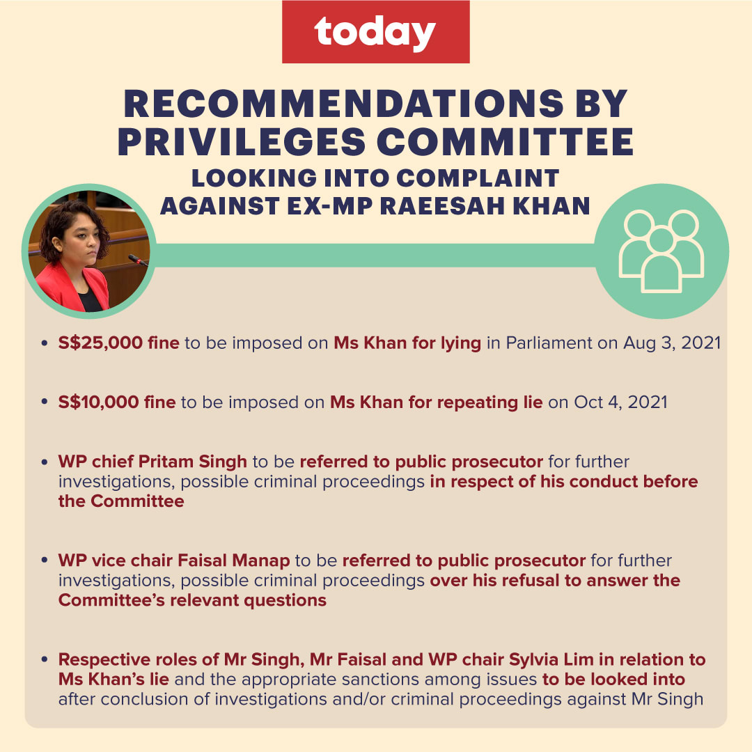 - It recommended that Parliament fines Ms Khan S$35,000 and refers WP chief Pritam Singh and WP vice-chair Faisal Manap to the public prosecutor