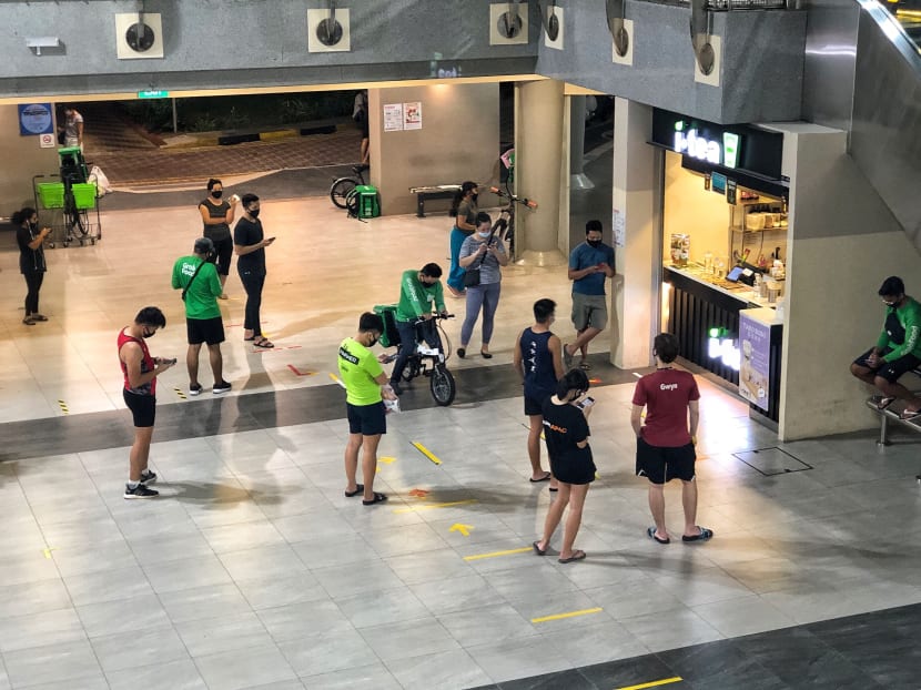 Delivery riders and and customers waiting to pick up their orders from an iTea outlet at Elias Mall in Pasir Ris. Photo: Raj Nadarajan/TODAY