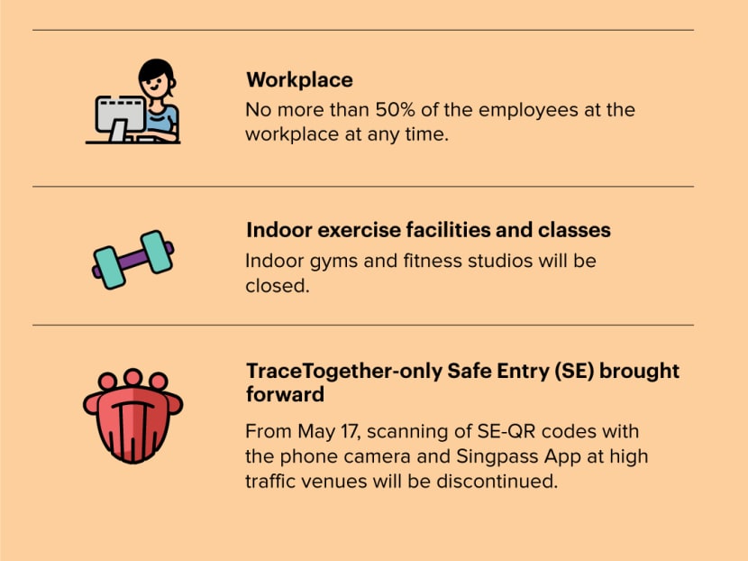 SINGAPORE — From May 8 to 30, the size of social gatherings and the daily number of visitors for each household will be reduced from a maximum of eight to five. Fewer employees will also be allowed to work in offices, while indoor gymnasiums and fitness studios will have to close.