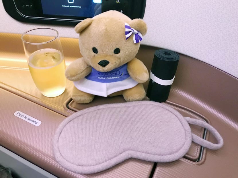 Singapore Airlines doesn't usually give amenity kits, but for the first three months on this route, passengers get their selection of lip balm, hand cream, fabric spray and stain remover, which are offered after takeoff. Eye masks, socks and slippers are also given to each passenger and the usual business-class amenities (facial mist, toothbrushes etc.) are in the bathrooms. BLOOMBERG