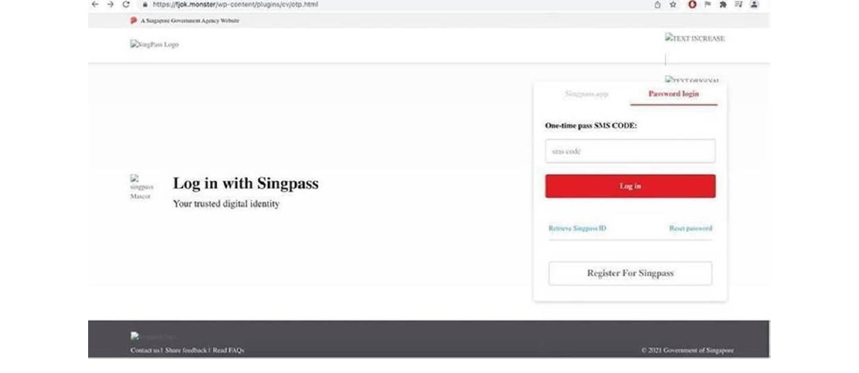 The phishing link leads the recipient to a fake website requesting him to enter his Singpass login identification, password and 2FA1 details.