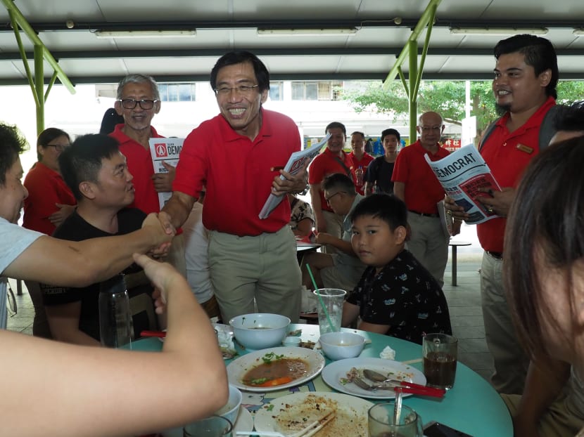 The Singapore Democratic Party's Dr Paul Tambyah and Mr Robin Low greeting residents at Ghim Moh Food Centre on Sunday (Nov 3) morning.