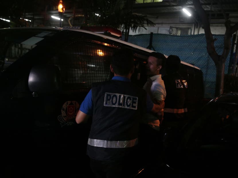 A man argues with police officers as he is arrested during an enforcement operation in a nightclub at St James Powerstation on 3 Dec, 2017. This photo has been digitally altered to protect identities of police officers and/or suspects. Photo: Jason Quah/TODAY