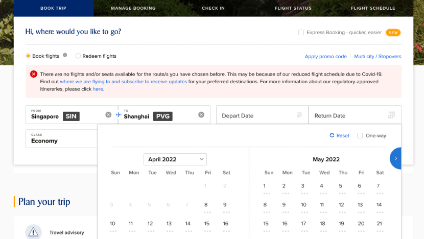 Checks by CNA showed that as of 10.50am on Friday, the SIA website was not taking in bookings for the route between Singapore and Shanghai. CNA
