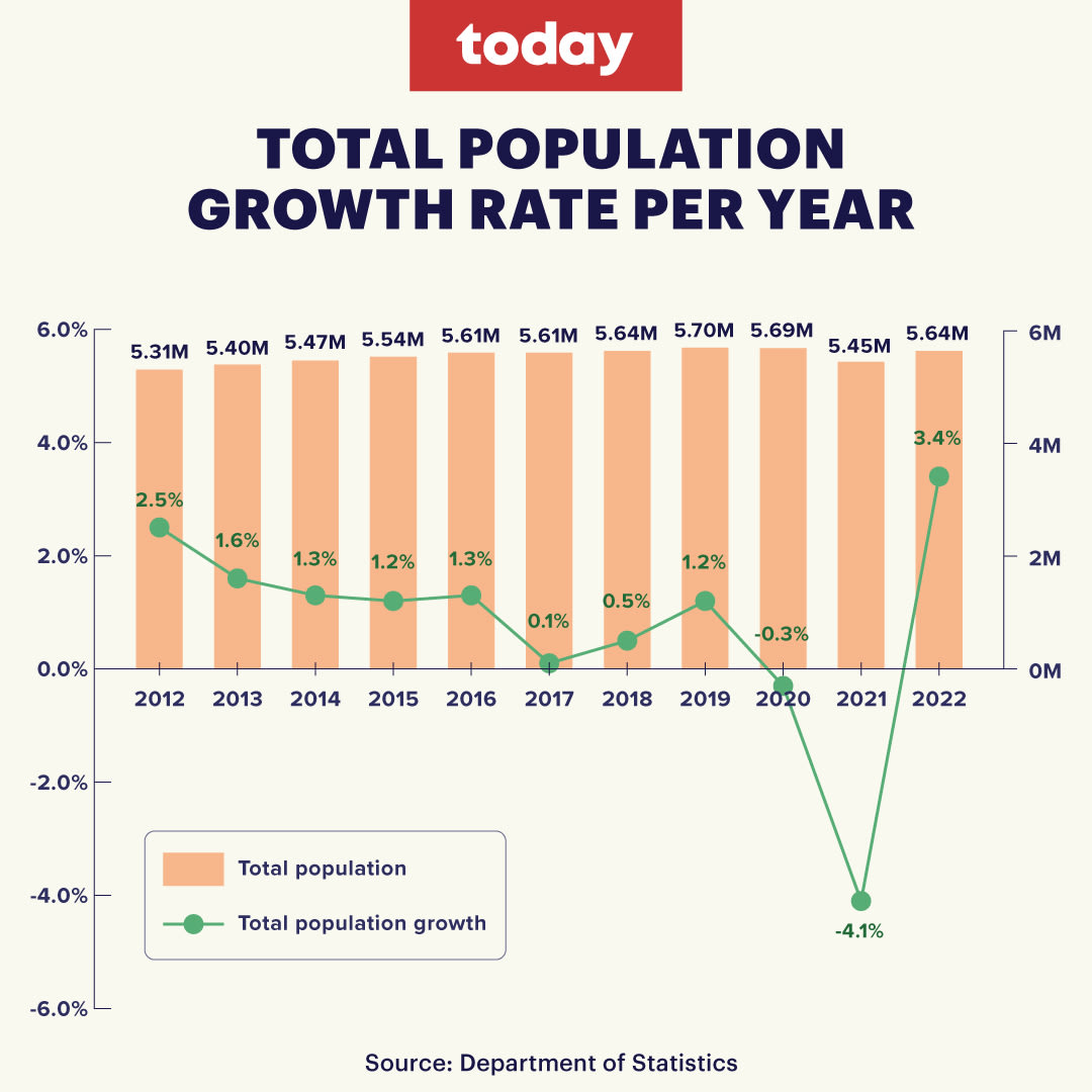 - Singapore's overall population jumped by 3.4 per cent year-on-year as of June 2022