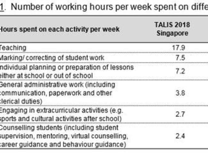 The survey, published on Wednesday (June 19), showed that Singapore teachers work 46 hours on average every week, of which 18 hours are spent on teaching, with the rest spent on other work such as administrative matters and school activities.