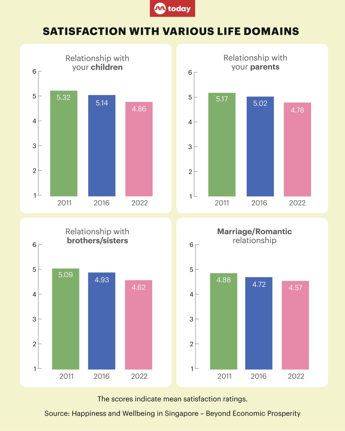 In all three surveys, Singaporeans were most satisfied with their relationship with their children, followed by their relationship with their parents, and then their siblings.