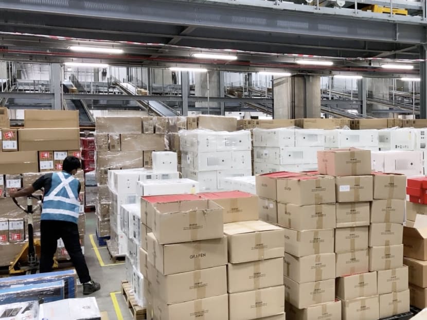 Workers packing and sorting high-valued items such as branded electronics at Lazada's warehouse in Singapore.