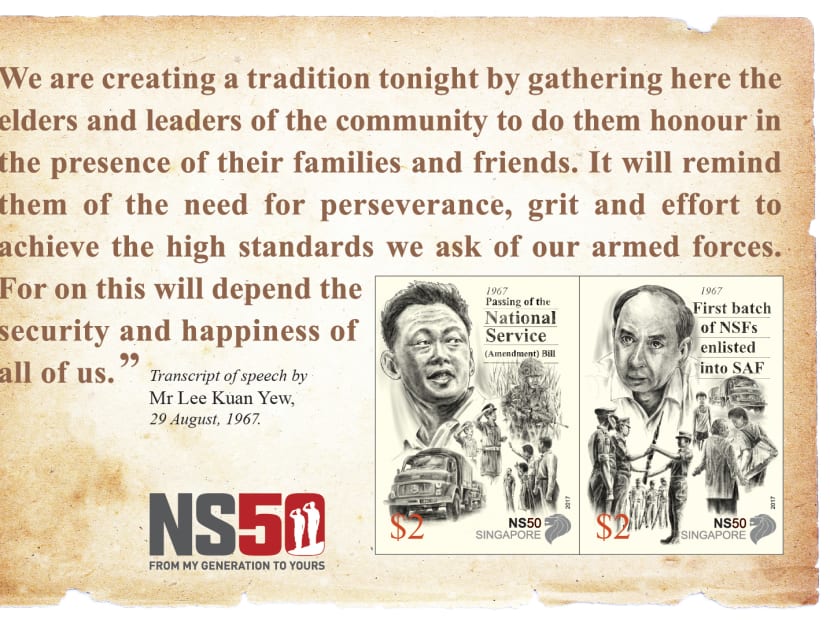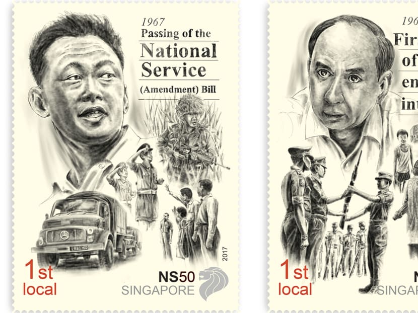 Founding Prime Minister Lee Kuan Yew and former Minister for Defence, Dr Goh Keng Swee, are also featured on the stamps for their roles in the introduction of National Service (NS).