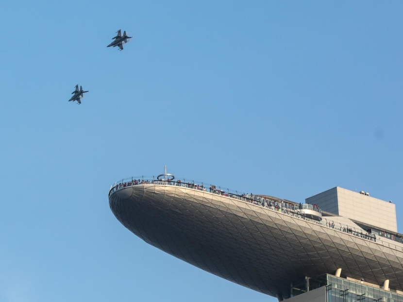 After the arrival of Members of Parliament and the parade inspection by President Halimah Yacob, two F-16 fighter jets flying in close proximity as they did a vertical climb through the air — the first time such a manoeuvre has been showcased at a NDP — left many in the audience captivated.