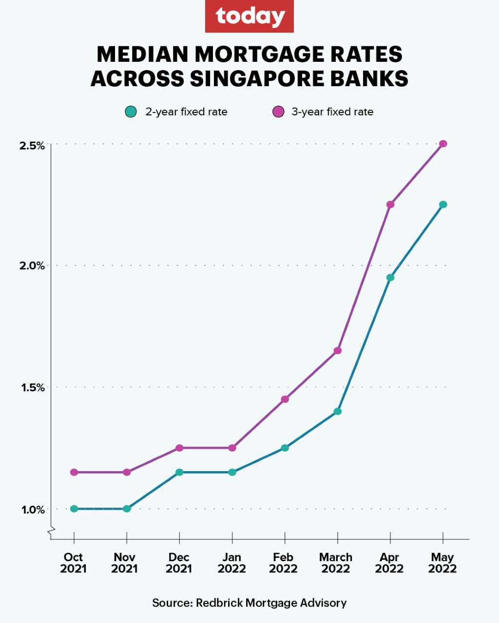 For a fixed two-year mortgage, the median rate across Singapore banks has increased from 1.15 per cent in December last year to 2.25 per cent in May, according to Redbrick Mortgage Advisory, a mortgage broker which compares interest rates from different banks.