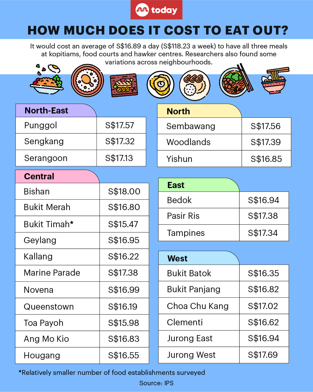 - Toa Payoh reported the lowest cost of S$15.98 for each person, while Bishan featured the highest average three-meal cost of S$18