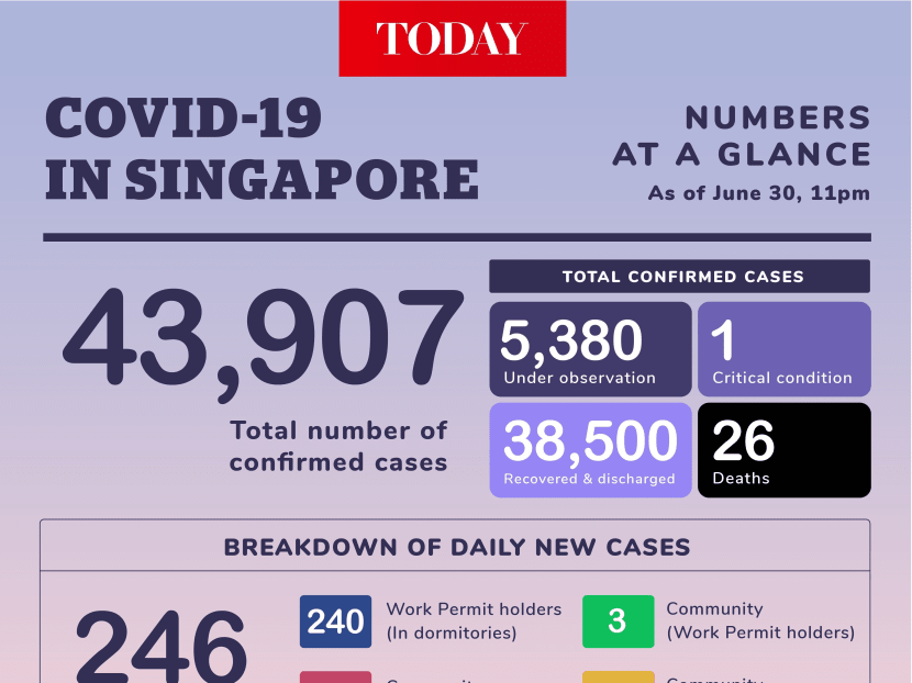 On Tuesday, MOH announced 246 new Covid-19 cases in Singapore. Of these, one was an imported case, five were identified as cases in the community while the remaining 240 were foreign workers staying in dormitories.