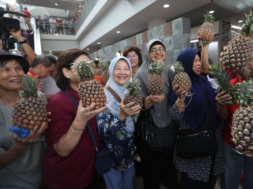 Supporters, armed with pineapples, began chanting “Ong lai, huat ah!” and “Majulah Singapura” in preparation for his arrival. "Ong lai", which means pineapple in Hokkien, is the symbol Mr Tharman used in his campaign.