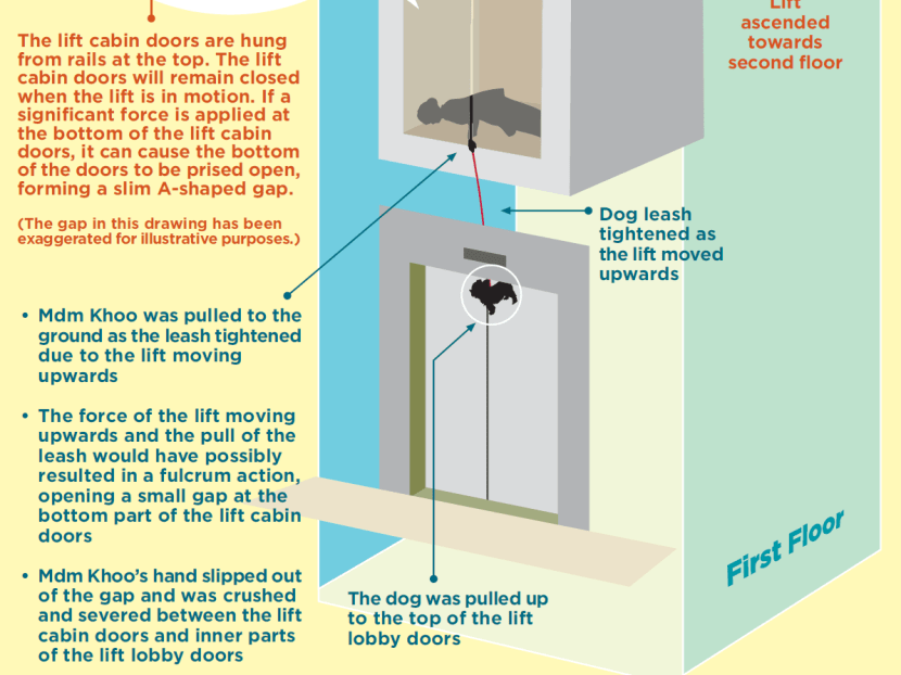 Madam Khoo Bee Hua’s left hand was severed on Oct 9 after she was separated from her dog while getting into the lift. In his report, the examiner provided an account of what happened that day, pieced together after analysing surveillance footage, a specialist medical report and other evidence gathered, and conducting interviews. He also performed tests on the lift and simulations of how the accident could have happened.