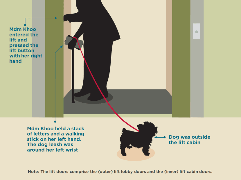 After the lift doors closed, the lift ascended, tightening the leash that was looped around Mdm Khoo’s wrist and pulling her down to the floor. On the ground floor, her dog was pulled upwards until it was caught at the top of the lift lobby door.