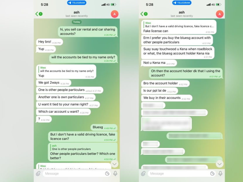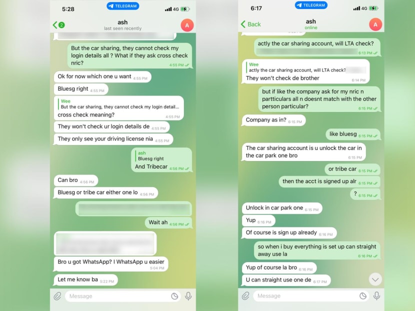 Sellers on Telegram employ two methods: They would either provide someone's personal information, such as a name and National Registration Identity Card (NRIC) number, for customers to use to create a new car sharing account, or they would provide login details of an existing account that belongs to someone else.