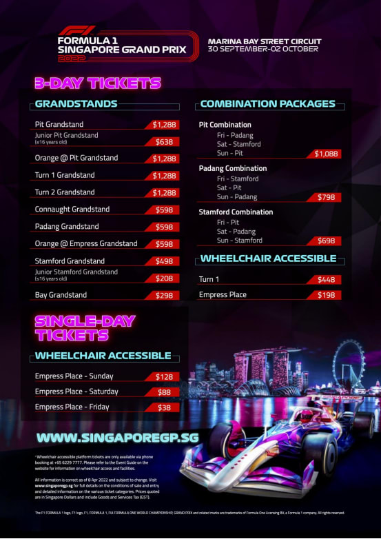 Tickets can be purchased via the official website, the Singapore GP ticketing hotline (+65 6229 7777) or via authorised ticketing partners.