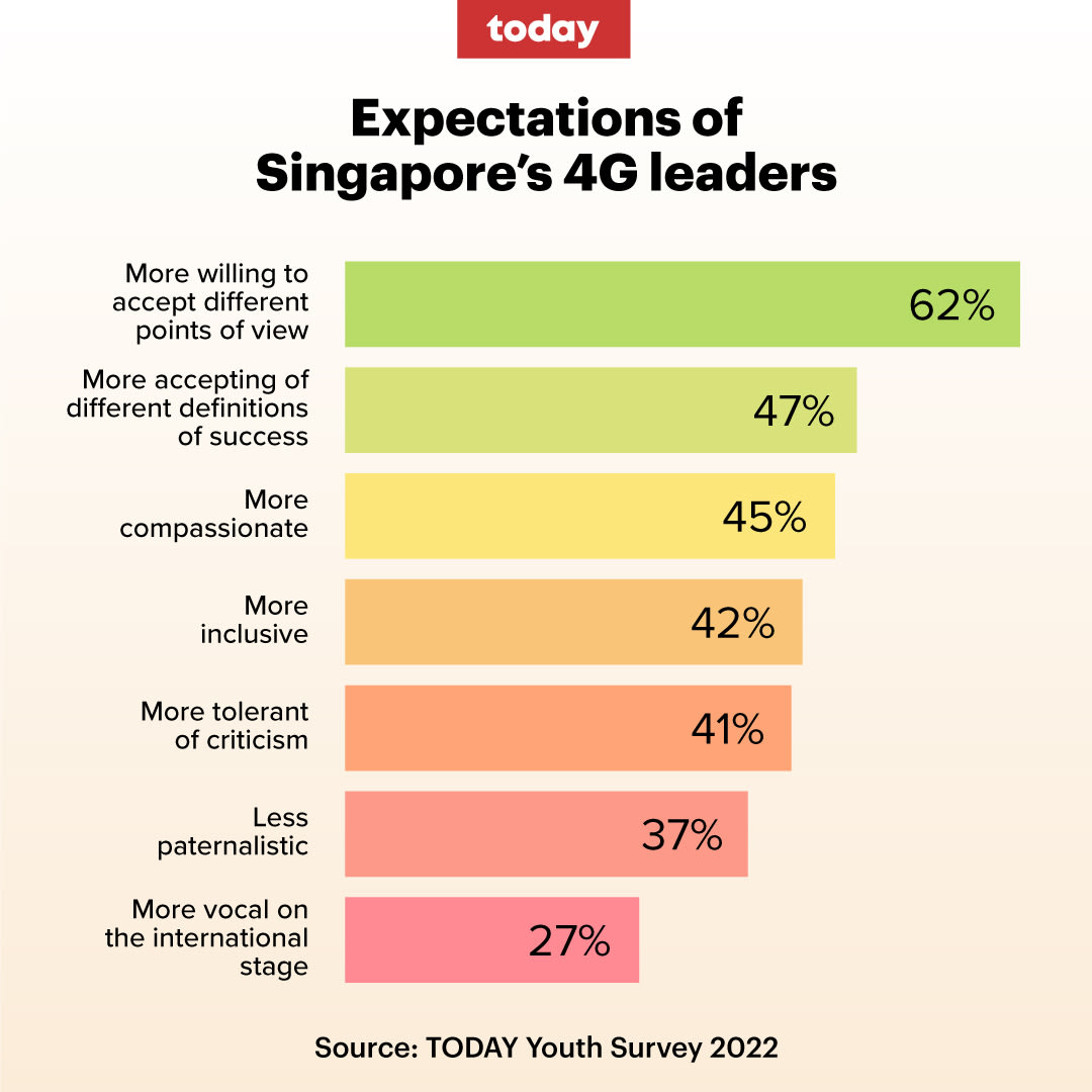 SINGAPORE — Ahead of Singapore's political leadership transition, a survey commissioned by TODAY has found that close to two-thirds (62 per cent) of youths expect the fourth-generation (4G) leaders to be more willing to accept different views.