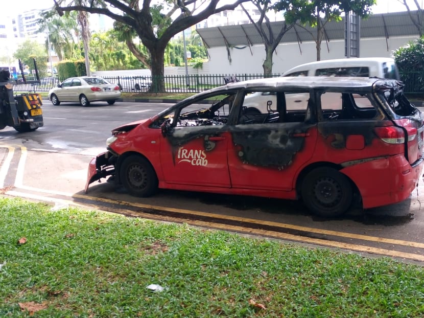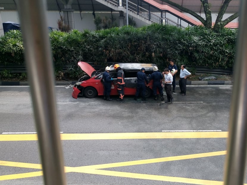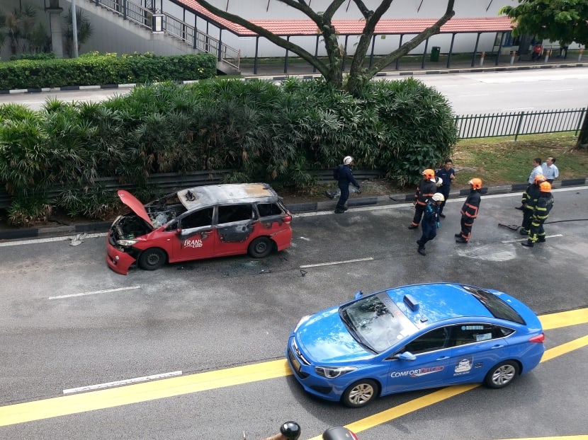 When TODAY arrived at the scene at around 2.30pm, Singapore Civil Defence Force (SCDF) officers had put out the fire. The taxi driver, a man in his 50s, suffered burn injuries and was sent to the Singapore General Hospital, SCDF said.