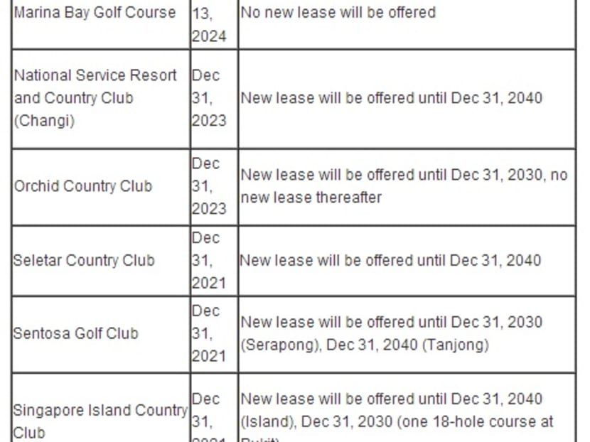 Of the nine golf clubs with leases expiring within the next 10 years, two — Keppel Club and Marina Bay Golf Club — will not have their leases renewed. Three others — Tanah Merah Country Club (TMCC) and National Service Resort and Country Club (NSRCC) and Singapore Island Country Club (SICC) — will have their leases extended but they will be giving up part of the land they now occupy.