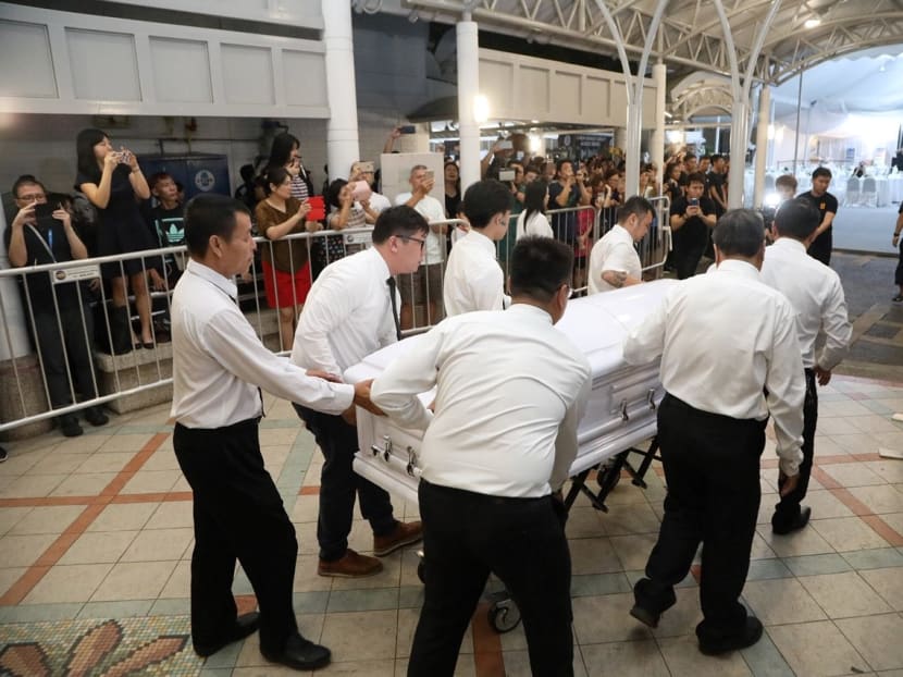 SINGAPORE — The murmuring crowd of about 100 or so people who had gathered at Block 82A, MacPherson Lane, fell into a hush when a white hearse carrying the body of the late actor Aloysius Pang came into sight.