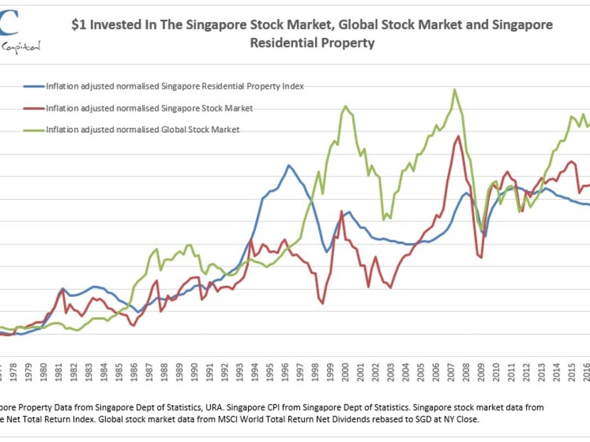 Although Singapore does not have a 100-year track record of property prices, we can look at the last 42 years to see how the returns compare with stocks.