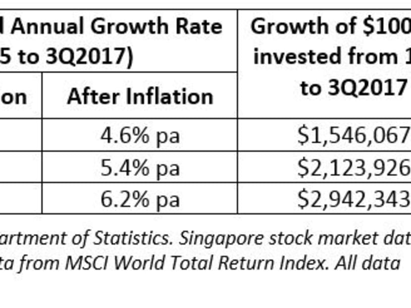 Using Singapore inflation and residential property data from the Department of Statistics stretching back to 1975, we found that S$1 invested in residential property for nearly 42 years would have yielded a return of 6.58 times (S$6.58) after inflation. That does not seem too bad, but how does this compare with investing in stocks? We replicated the same time period analysis on the stock markets and found that investing in the local stock market would have yielded a return of 9.04 times (S$9.04), and 12.53 times (S$12.53) if invested in the global stock market over the same period, and after adjusting for inflation. The equivalent annualised returns are shown in the table below.