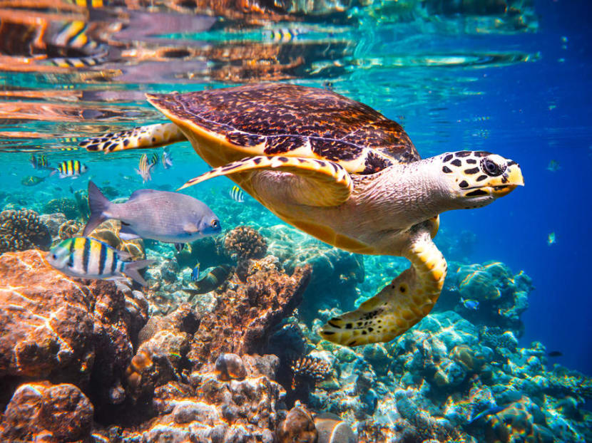 The critically endangered Hawksbill turtle is found in tropical waters, including around Singapore. This one is in a coral reef in the Maldives. Photo: Andrey Armyagov/Shutterstock.com