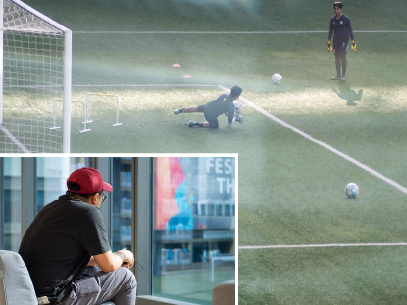 After doing this for five years now, Mr Affendi has his personal favourite training site — Our Tampines Hub. After dropping Nazhan off, Mr Affendi parks the car and heads up to Tampines Regional Library, where there are sofas that overlook the field.
