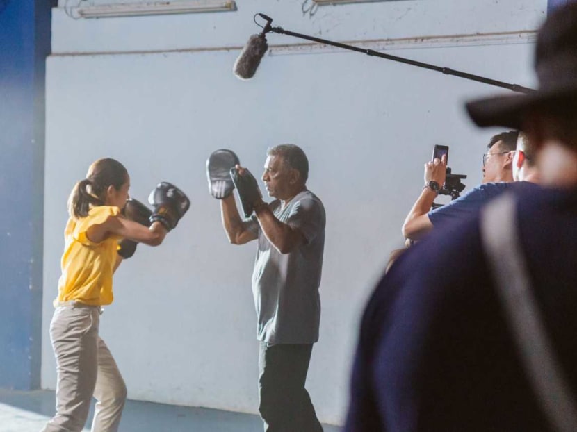 Boxing coach Thangavelu Balasundram puts an actor through her paces at the old boxing stadium in Farrer Park during the film production. Photo: Splash Productions