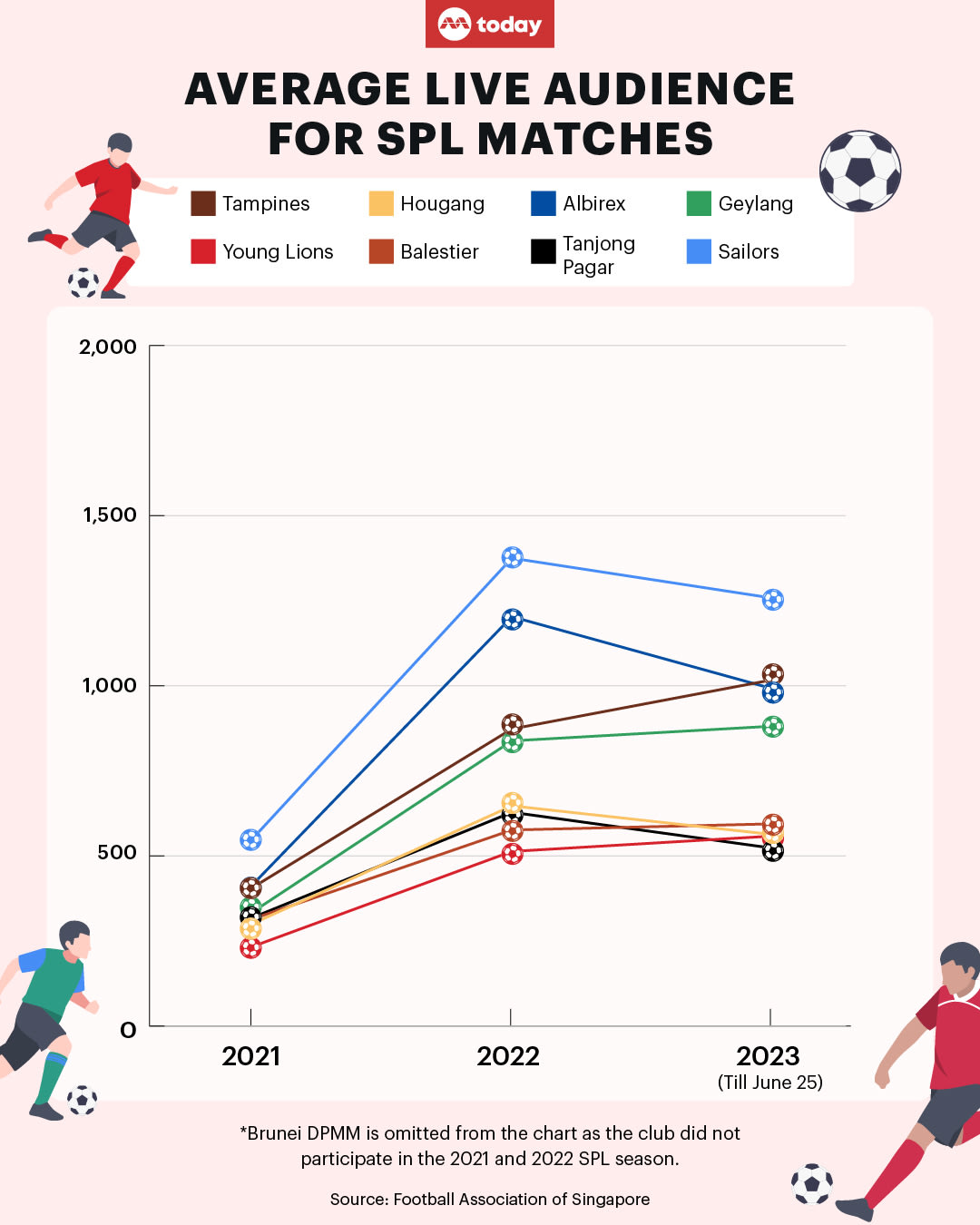 In 2023, that number has fallen to 752 for all the matches after approximately 17 game weeks, a figure slightly below last year’s average of 832 for the entire season, according to numbers provided by the Football Association of Singapore (FAS).