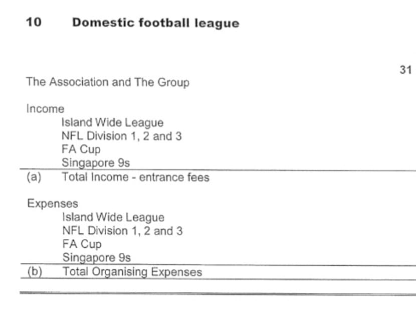The FAS financial statement for the financial year ended March 31, 2016, showed the association’s net spend on grassroots competitions — the National Football League (NFL), the Island Wide League (IWL), Singapore 9s and FA Cup — to be about S$70,000.