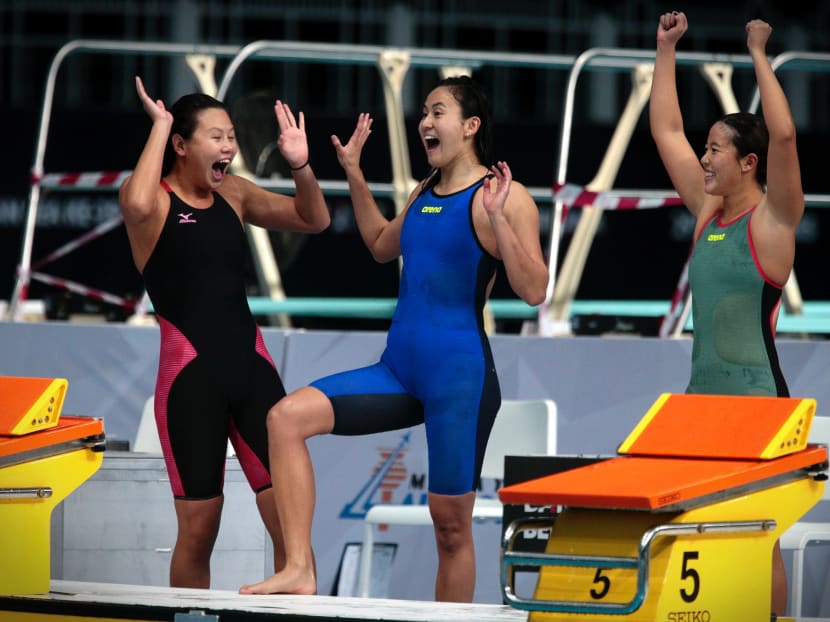 Quah Jing Wen, Christie Chue, Quah Ting Wen and Rachel Tseng react after winning the SEA Games womens 4x200m freestyle relay. Photo: Jason Quah/TODAY
