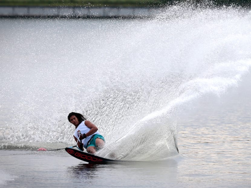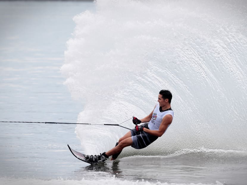 Sasha Christian (left) and Mark Leong competing in their respective water skiing events. Photos: Jason Quah/TODAY