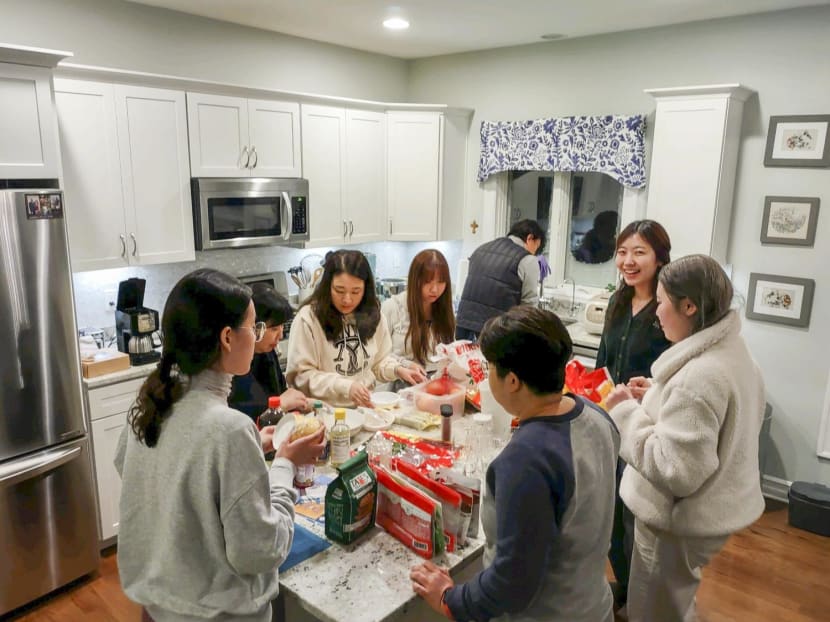 Mr Alexander Campagna (left most) and his wife, Andrea, with the nine stranded South Korean tourists and their driver in their home. The guests prepared Korean dishes, like spicy stir-fried pork, during the holiday weekend.