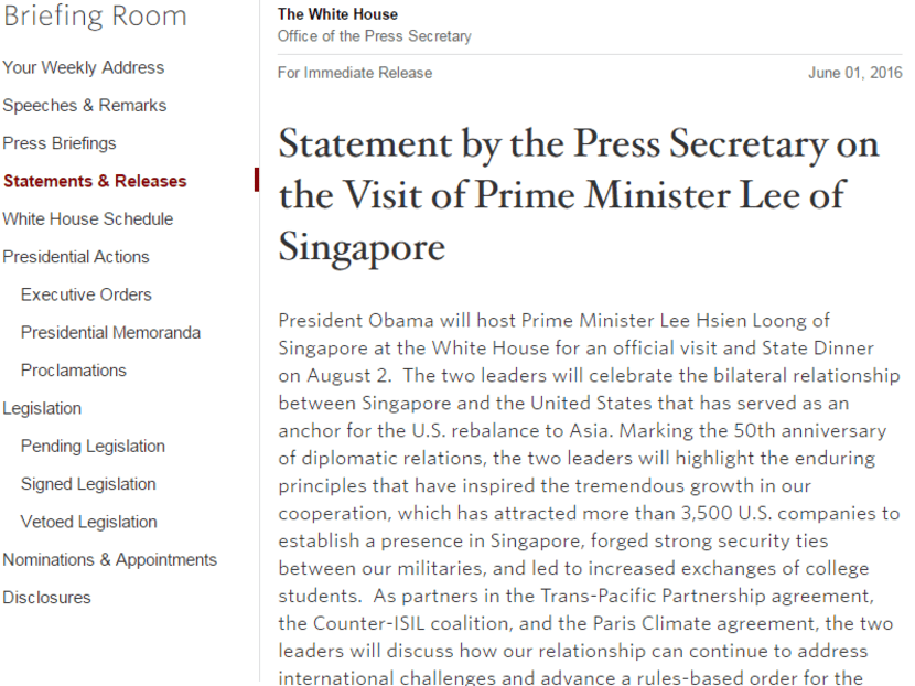 In a statement issued on Wednesday (June 1), the White House said the bilateral relationship between Singapore and the US has “served as an anchor for the US rebalance to Asia”.